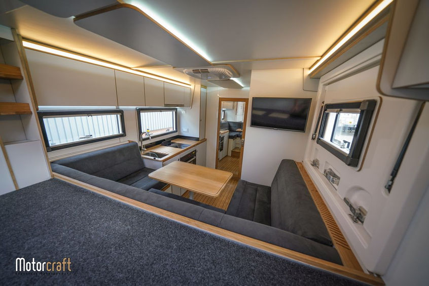 We build every part of our trucks ourselves - from the frame and furniture to kitchens and bathrooms. Working with Motorcraft Overland Accessories, each vehicle is fitted out for off‑grid, self‑sufficient living. Inside, you’ll find smart storage, comfortable living spaces, durable finishes, and everything needed to live on the road with ease and reliability.