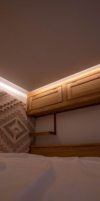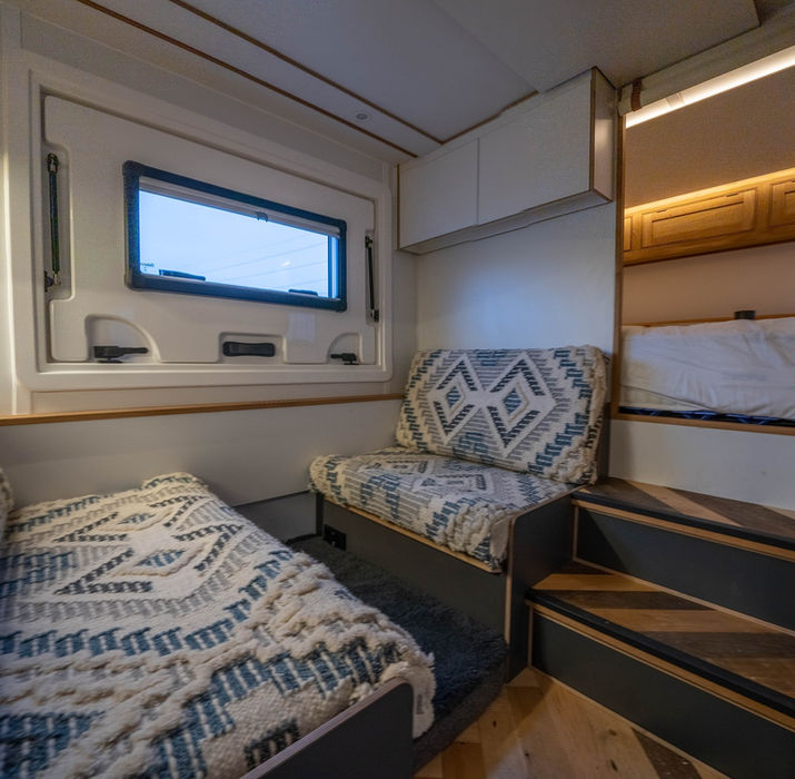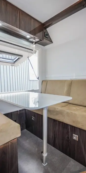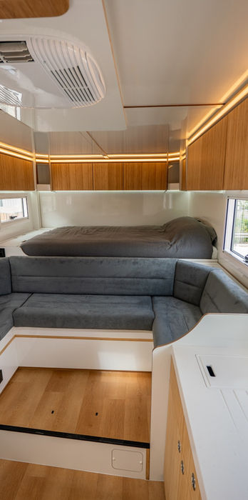 We build every part of our trucks ourselves — from the frame and furniture to kitchens and bathrooms. Working with Motorcraft Overland Accessories, each vehicle is fitted out for off‑grid, self‑sufficient living. Inside, you’ll find smart storage, comfortable living spaces, durable finishes, and everything needed to live on the road with ease and reliability.
